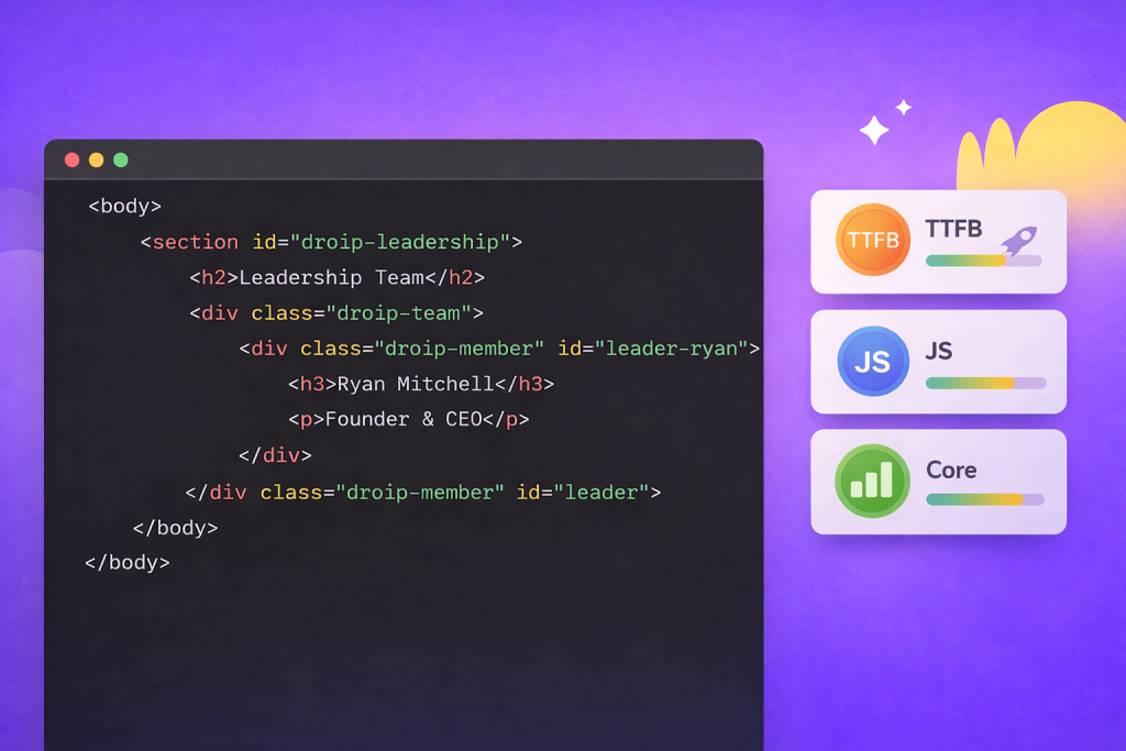 Elementor pages often rely on deeply nested divs and wrapper elements, which can bloat the DOM and negatively impact Core Web Vitals. Droip generates leaner HTML with fewer wrappers . Droip aligns well with modern SEO requirements: